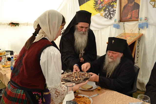 Когда они выходили из храма под колокольный звон, иерархов встречали с цветами мальчики и девочки в традиционных сербских народных костюмах, а по пути к трапезе любви дети бросали лепестки роз им на дорогу.